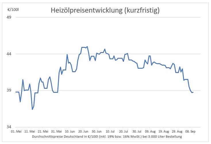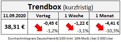 Doch ab August zeichnete sich wieder ein Rückgang ab, der nun im September sogar noch einmal stärker wurde und Heizöl im Durchschnitt wieder auf das Niveau von Ende Mai gerutscht ist. Die kurzfristige Trendbox zeigt, dass auf Wochensicht gesehen die Heizölpreise weiter nachgegeben haben.