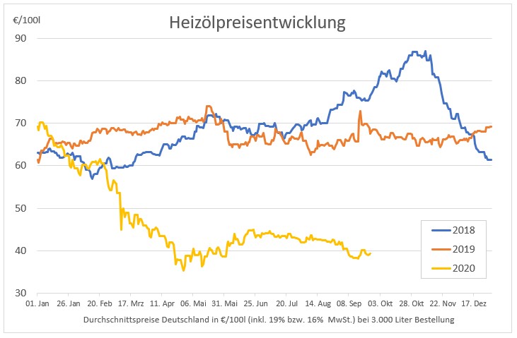 Für Verbraucher, die noch Platz im Tank haben, ist jetzt der richtige Zeitpunkt, sich vor dem Winter noch einmal einzudecken. Nicht nur die niedrigen Rohölpreise sorgen momentan nämlich für günstige Preise. Wer Heizöl kauft, profitiert im Moment auch von der temporären Mehrwertsteuersenkung von 19% auf 16%. Außerdem wird mit der Einführung der CO2-Steuer zum neuen Jahr auch für Heizöl ein Aufschlag fällig, der die Preise ab 2021 etwas verteuern wird.