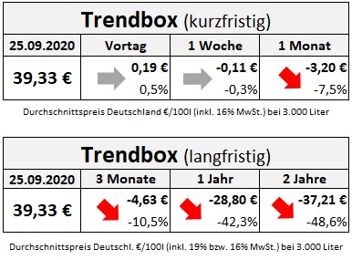 Dem statistischen Preisvergleich zufolge geben die Heizölpreise schon seit einiger Zeit wieder nach. In dieser Woche sorgten die neu aufflammenden Unsicherheiten bezüglich einer zweiten Corona-Welle in Europa für zusätzlichen Preisdruck. Für Verbraucher ist damit jetzt ein guter Zeitpunkt, den Tank voll zu machen.