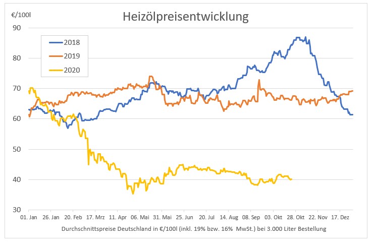 Die genannten Heizölpreise beziehen sich stets auf den deutschlandweiten Durchschnittspreis bei einer Bestellung von 3.000 Liter Heizöl Standard schwefelarm inklusive 19% MwSt. bzw. seit 1.Juli 2020 16% MwSt. Außerdem fallen durch Transportkosten die Preise regional unterschiedlich aus. Die Preisspanne zwischen den Regionen kann daher momentan bei bis zu ca. 1,10 Euro pro 100 Liter liegen. Stand der Preise 23.10.2020