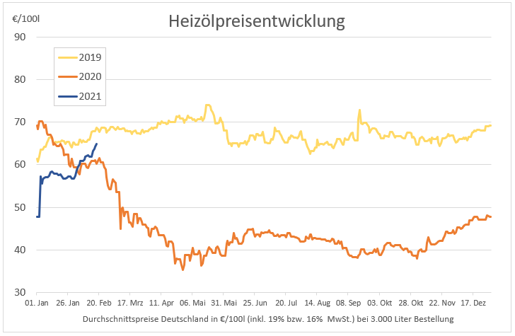 Die genannten Heizölpreise beziehen sich stets auf den deutschlandweiten Durchschnittspreis bei einer Bestellung von 3.000 Liter Heizöl Standard schwefelarm inklusive 19% MwSt. bzw. vom Zeitraum 1.Juli bis 31.Dezember 2020 16% MwSt. Außerdem fallen durch Transportkosten die Preise regional unterschiedlich aus. Die Preisspanne zwischen den Regionen kann daher momentan bei bis zu ca. 1,41 Euro pro 100 Liter liegen. Stand der Preise 19.02.2021