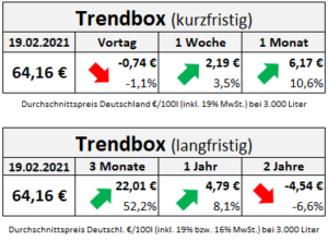 Die börsengehandelten Rohölpreise befinden sich seit Anfang November in einem stetigen Aufwärtstrend, der sich seit Anfang Februar noch einmal verschärft hatte und damit auch die Heizölpreise mit in die Höhe gezogen hat. Seit Anfang Februar sind die durchschnittlichen Heizölpreise um insgesamt 11,6 Prozent bzw. 6,68 Euro gestiegen. Allein seit letztem Freitag sind die Inlandspreise um durchschnittlich 2,19 Euro gestiegen.