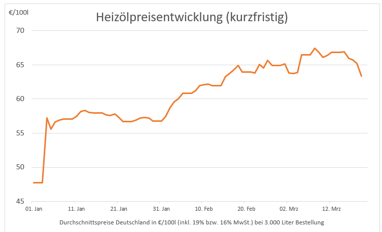 Der Wochendurchschnittspreise für diese Woche lag knapp 2 Prozent unter dem Wochendurchschnittspreise von letzter Woche. Im Vergleich zum Freitag vor einem Monat kostet Heizöl heute durchschnittlich knapp einen Euro weniger. Die kurzfristige Preisentwicklung zeigt, dass die durchschnittlichen Inlandspreise die Steigerungen, welche bisher im März verzeichnet worden waren, wieder abgegeben hat.