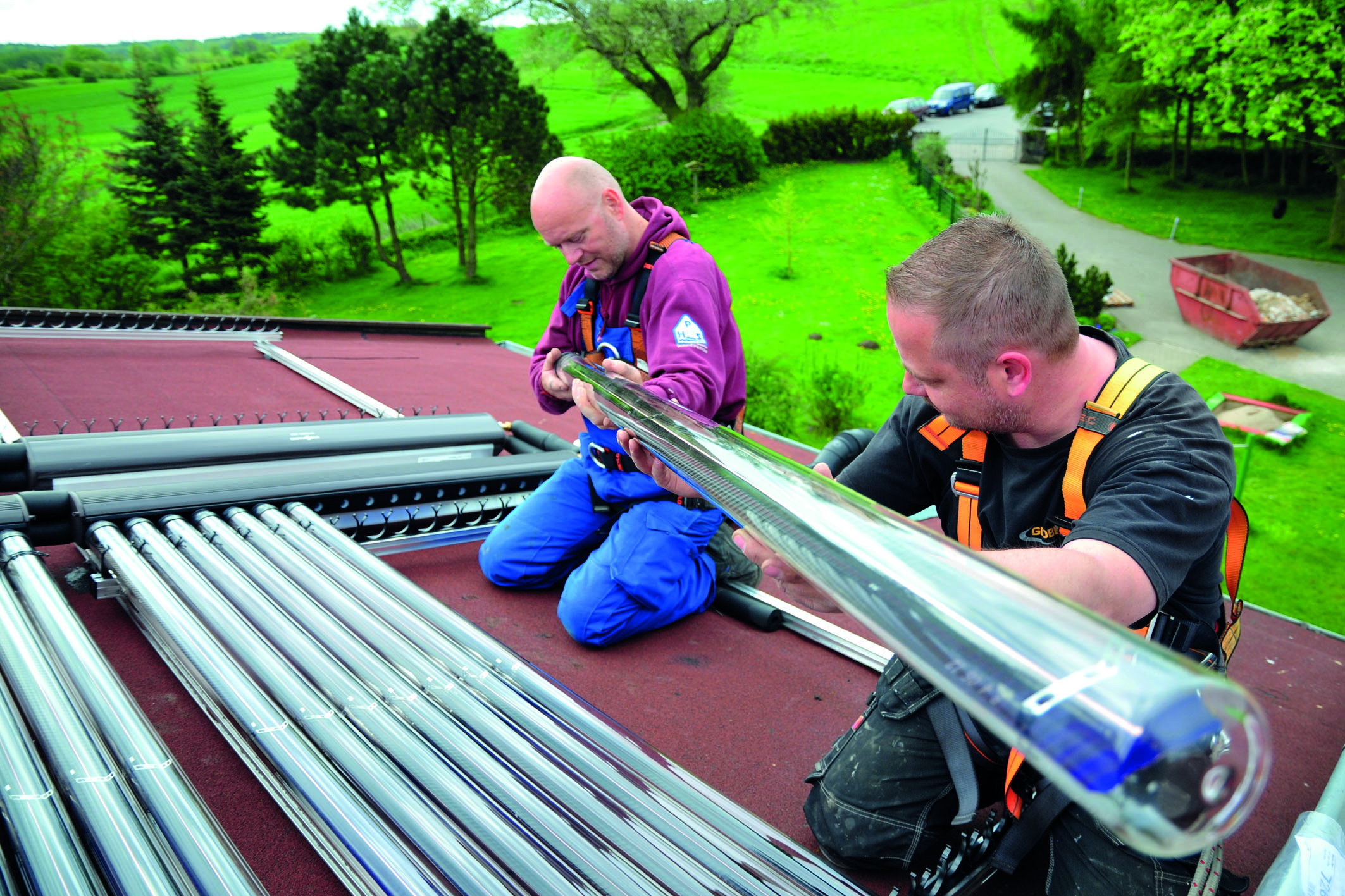 Parallel dazu wurde die Energieversorgung umgebaut. Die Heizung aus dem Jahr 2000 wurde durch ein modernes, zweistufiges Öl-Brennwertgerät ersetzt, das eine Energieeffizienz von bis zu 98 Prozent ermöglicht. Dem modernen Kessel stellten sie auf dem Hausdach eine Röhrenkollektoren-Solarthermieanlage mit 11,5 Quadratmetern Fläche zur Seite. Seitdem muss die Öl-Brennwertheizung nur noch dann einspringen, wenn die Sonnenenergie nicht ausreicht, um das Heizsystem zu bedienen. Später kam auch noch Photovoltaik hinzu. Das Herzstück dieses Systems befindet sich direkt neben dem Öl-Brennwertgerät im Keller des Wohnhauses. Es besteht aus zwei Wärmespeichern, die jeweils 600 Liter fassen. In ihnen wird die Energie der verschiedenen Quellen gespeichert und bei Bedarf abgegeben. Das Erhitzen des Brauchwassers geschieht durch einen Platten-Wärmeübertrager: Warmes Wasser für Küche oder Bad muss damit nicht in einem Tank vorgehalten werden, sondern wird immer ganz frisch im Durchflussverfahren erzeugt.