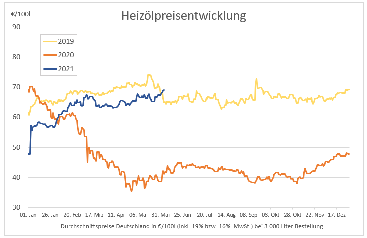 Die genannten Heizölpreise beziehen sich stets auf den deutschlandweiten Durchschnittspreis bei einer Bestellung von 3.000 Liter Heizöl Standard schwefelarm inklusive 19% MwSt. bzw. vom Zeitraum 1.Juli bis 31.Dezember 2020 16% MwSt. Außerdem fallen durch Transportkosten die Preise regional unterschiedlich aus. Die Preisspanne zwischen den Regionen kann daher momentan bei bis zu ca. 1,40 Euro pro 100 Liter liegen. Stand der Preise 04.06.2021