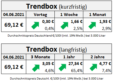 Erstmals seit Ausbruch der Corona-Pandemie im Frühjahr 2020 zeigen sowohl die kurzfristige als auch die langfristige Trendbox ausschließlich grüne Pfeile. Im Vergleich zu gestern hat der durchschnittliche Heizölpreis in Deutschland um etwa 30 Cent zugelegt. Im Vergleich zum Freitag vor einer Woche beträgt die Preissteigerung sogar 1,66 Euro durchschnittlich.