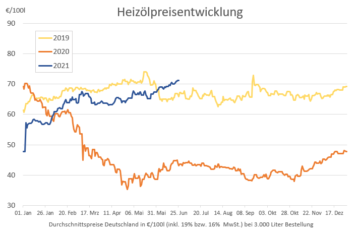 Die genannten Heizölpreise beziehen sich stets auf den deutschlandweiten Durchschnittspreis bei einer Bestellung von 3.000 Liter Heizöl Standard schwefelarm inklusive 19% MwSt. bzw. vom Zeitraum 1.Juli bis 31.Dezember 2020 16% MwSt. Außerdem fallen durch Transportkosten die Preise regional unterschiedlich aus. Die Preisspanne zwischen den Regionen kann daher momentan bei bis zu ca. 1,45 Euro pro 100 Liter liegen. Stand der Preise 25.06.2021