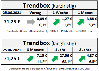 Die Trendboxen spiegeln diesen Trend eindeutig wieder, denn sie werden beherrscht von grünen Pfeilen. Im Vergleich zu letztem Freitag sind die durchschnittlichen Heizölpreise um 1,8 Prozent gestiegen, im Vergleich zu letztem Monat sogar um 5,8 Prozent. Verglichen mit Donnerstag hält sich der Preisanstieg jedoch in Grenzen und so kosten 100 Liter heute nur knapp einen Cent mehr als gestern.