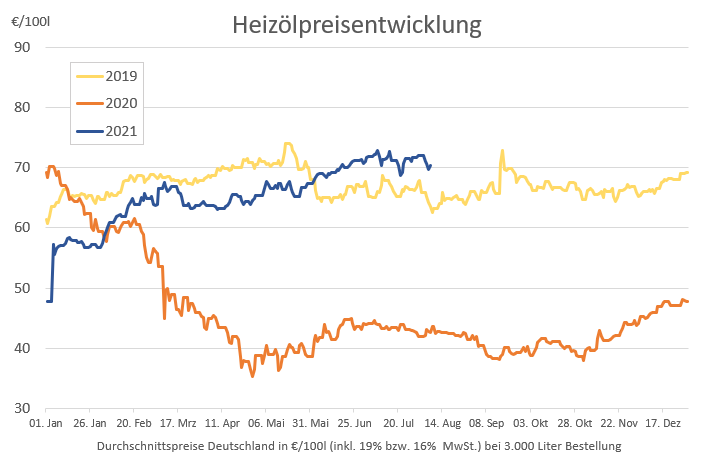 Die genannten Heizölpreise beziehen sich stets auf den deutschlandweiten Durchschnittspreis bei einer Bestellung von 3.000 Liter Heizöl Standard schwefelarm inklusive 19% MwSt. bzw. vom Zeitraum 1.Juli bis 31.Dezember 2020 16% MwSt. Außerdem fallen durch Transportkosten die Preise regional unterschiedlich aus. Die Preisspanne zwischen den Regionen kann daher momentan bei bis zu ca. 1,37 Euro pro 100 Liter liegen. Stand der Preise 06.08.2021