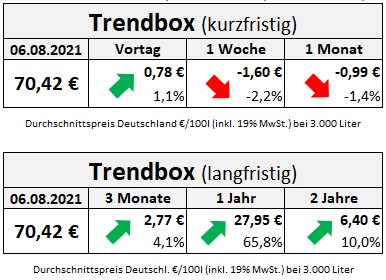 Entsprechend kosten 100 Liter Heizöl die Verbraucher heute durchschnittlich 1,60 Euro weniger als am vergangenen Freitag. Im August sind die Preise im Bundesweiten Durchschnitt entsprechend schon über 2 Prozent gesunken, auch wenn seit gestern wieder ein leichter Anstieg zu verzeichnen ist. Demnach muss heute mit Aufschlägen von etwa 0,78 Euro oder 1,1 Prozent im Vergleich zu Donnerstag gerechnet werden.